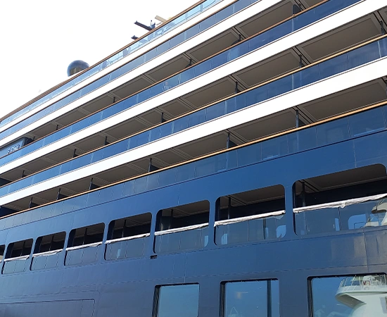 Glasswalls is a system for enclosing ships, consisting of various types of windows made with aluminum frames and glass panels.